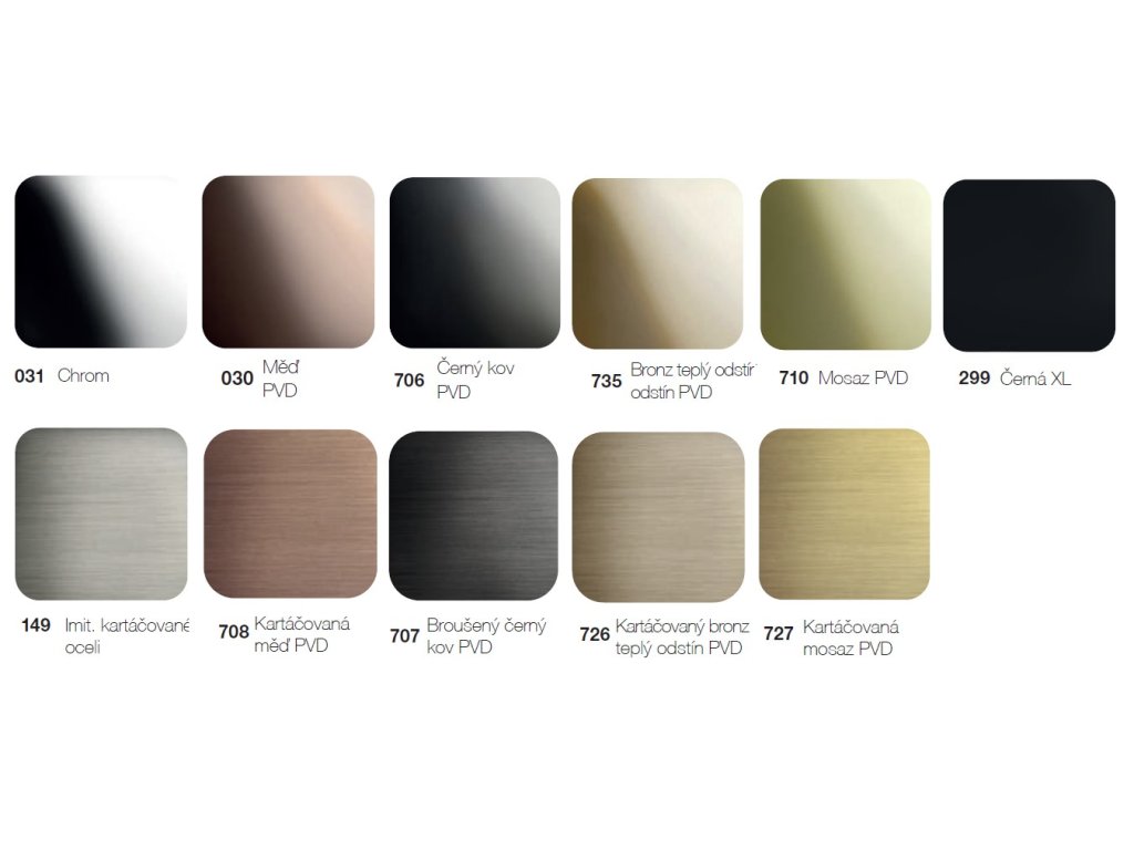 | Povrch/materiál: | chrom, měď, kartáčovaná měď, černý kov, broušený černý kov, imitace kartáčované oceli, černá XL |